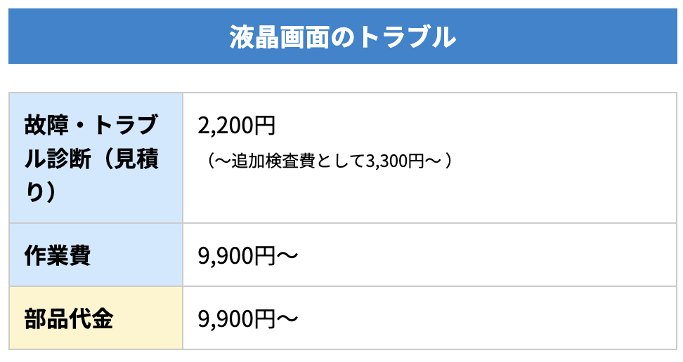 基本的な作業料金で、画面の状況を把握するために分解などが必要になると、分解料金の2,200円(税込)~が加算されます。