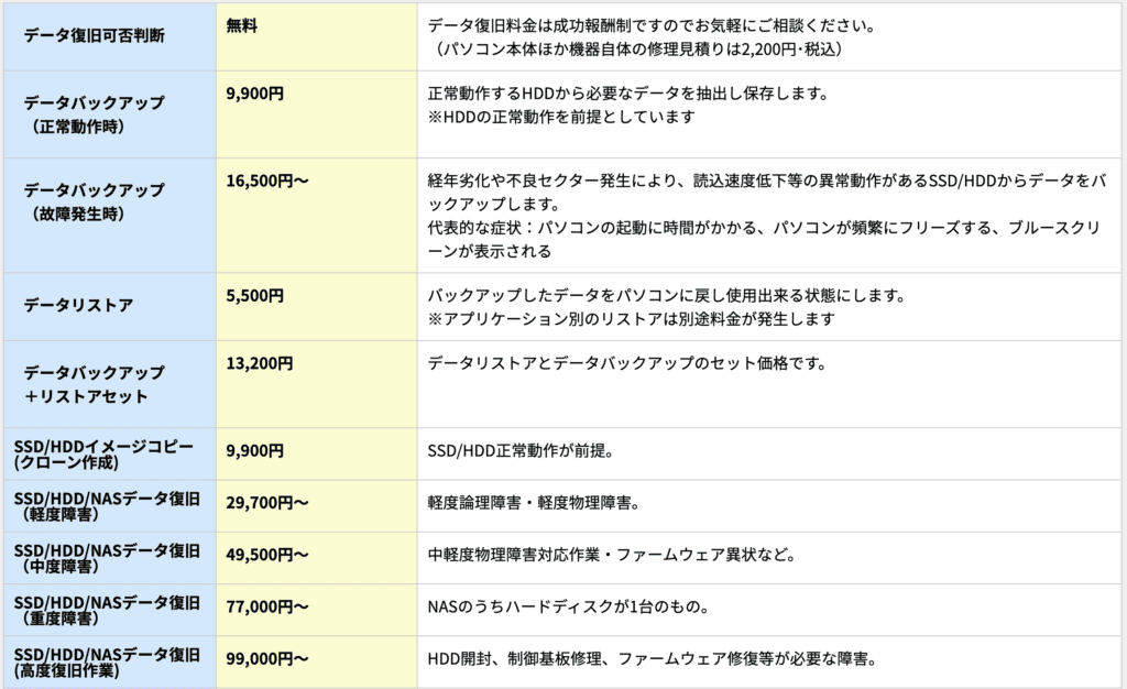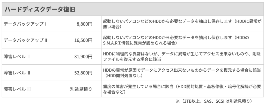| HDD作業料金 | 27,500円〜 | 29,700円~ | 25,300円〜 |