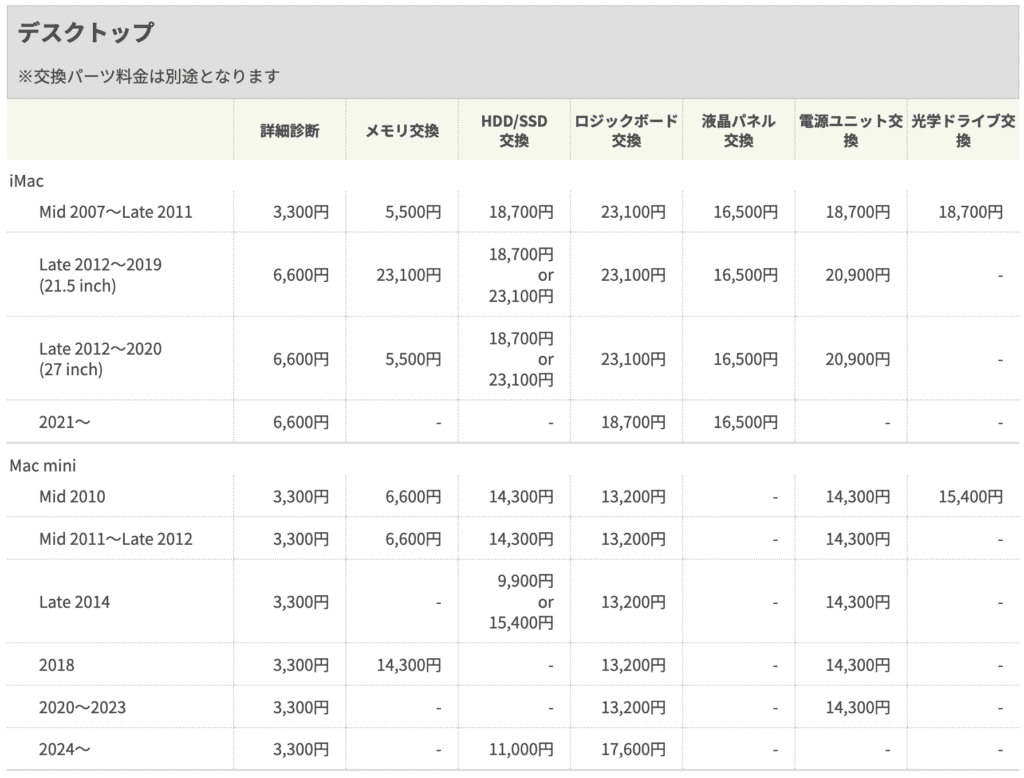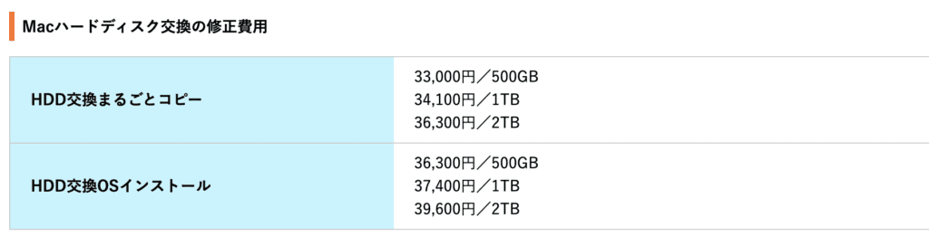 Macが起動しないトラブルには、HDD・SDDの交換にも対応しています。ノート・デスクトップ・その他で症状別でおよその料金を提示しているため、修理にかかる費用のイメージが掴みやすいでしょう。