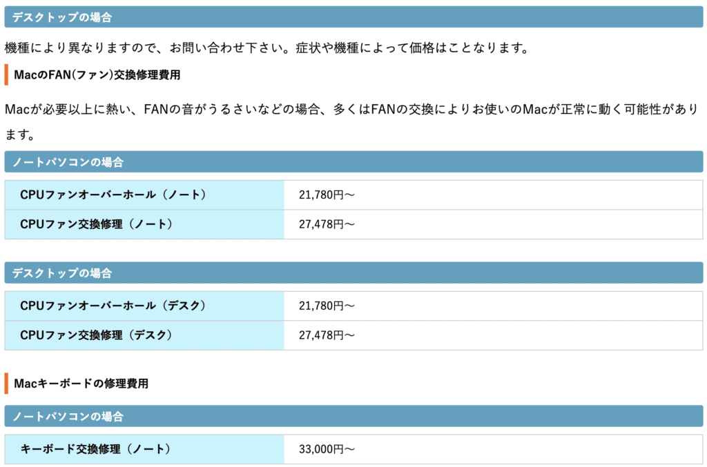 PCホスピタルのMacの作業料金例は以下の通りです。