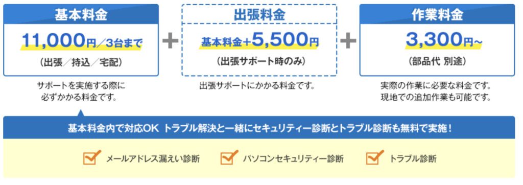 PCホスピタルでは、作業料金のほか、基本料金 8,800円(税込)(※)と出張料金 2,200円(税込)(※)が必要です。