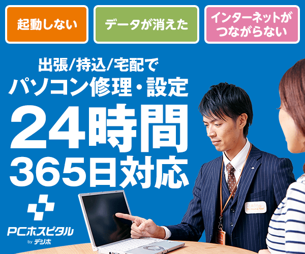 パソコン博士の知恵袋はパソコン修理業者大手(上場企業)の PCホスピタルPCホスピタル(年間サポート実績約10万件※1、全国約400拠点 ※2)をおすすめしています。 電話対応も丁寧で、お住まいの地域(全国対応)に応じたパソコン修理サービスを提案してくれます。