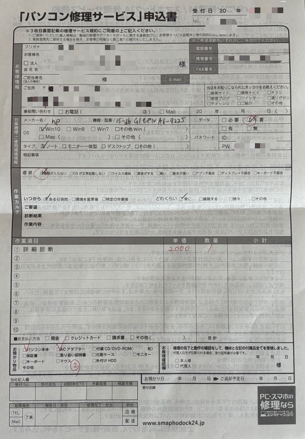 正確な見積もりのためには、まずパソコンを預かって検査する必要があるとのことでした。検査費用は2,200円(税込)で、万が一修理をキャンセルした場合はこの検査費のみで済むと明記されており、気軽に持ち込める安心感があります。